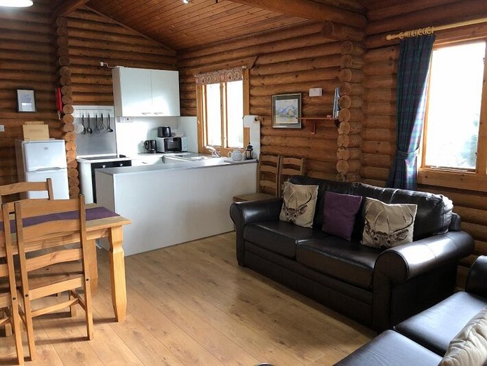 The Norwegian lodges near Loch Ness are constructed of solid round pine logs interlocked together. The open plan lounge, dining, and well equipped kitchen easily caters for up to 6 people.